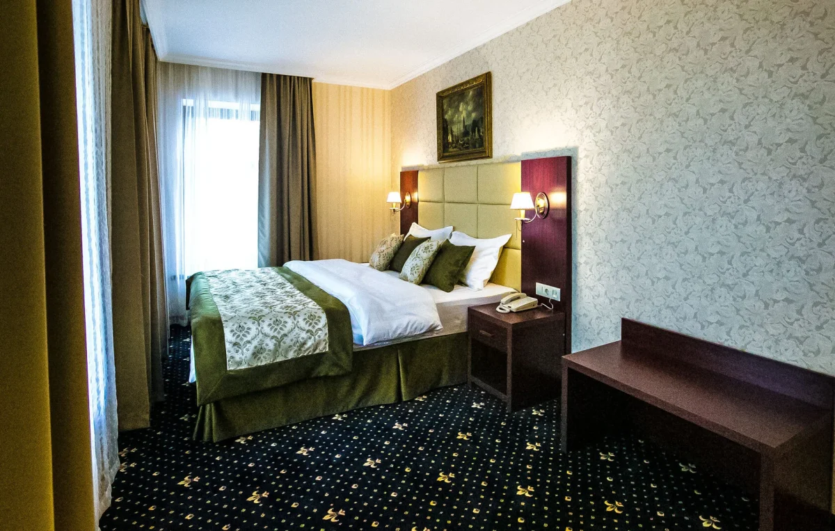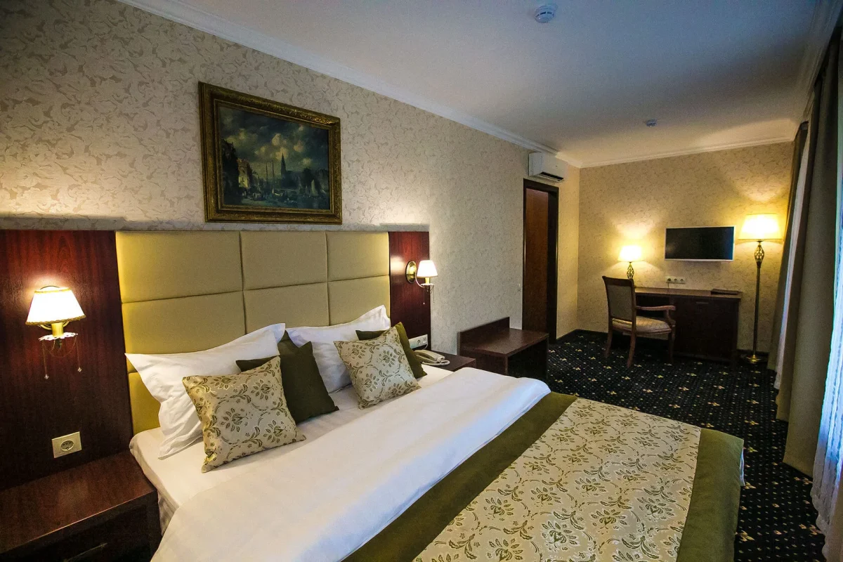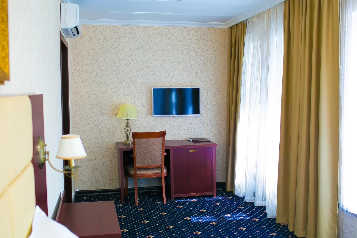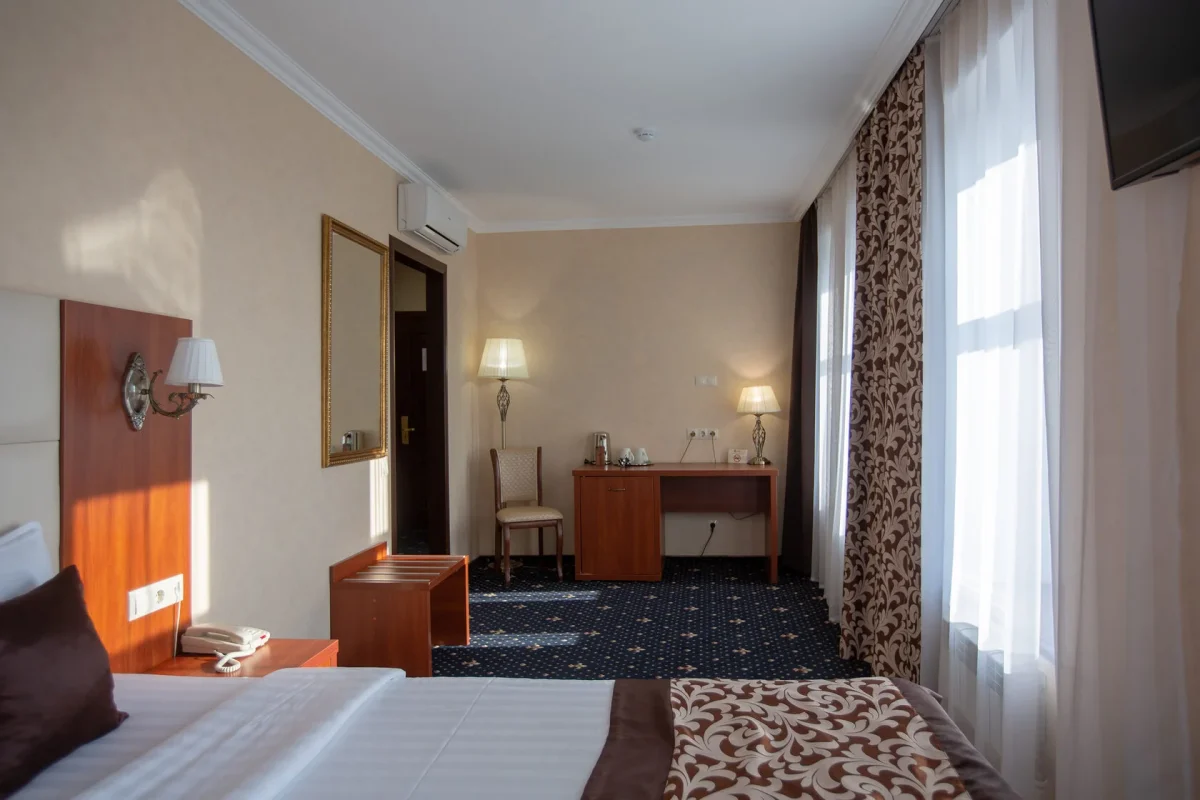 Номер оборудован элегантной кроватью, комфортным рабочим местом, шкафом-купе, сейфом, мини-холодильником.